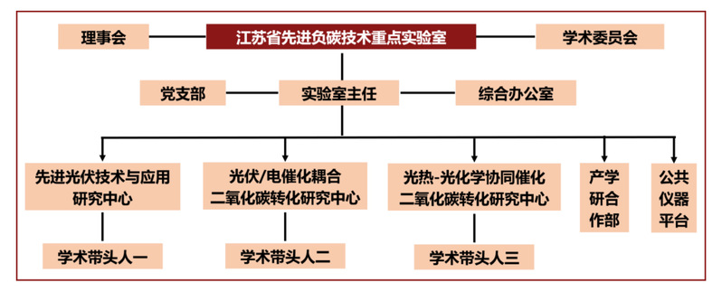江苏省先进负碳技术重点实验室作为苏州大学的直属科研机构以及与学院平行的二级单位,拥有独立的人财物自主权,实行理事会领导下、学术委员会指导下的主任负责制。理事会是实验室的最高决策和监督机构,由依托单位分管校领导、地方科技部门分管领导、共建单位负责人、依托单位相关职能部门负责人等组成。实验室设立学术委员会作为实验室学术指导机构,对实验室发展战略规划、学术方向、人才队伍建设、产业化等提供咨询和建议,促进实验室与国际、国内相关机构之间的交流与合作。实验室设立党支部,为实验室发展提供政治和组织保障。